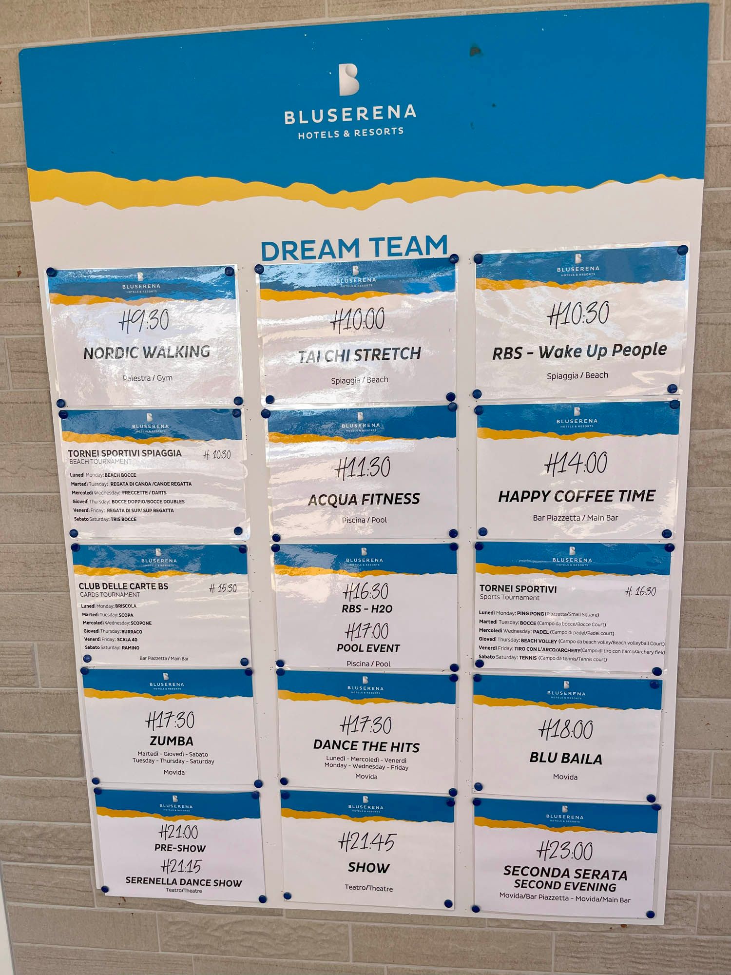 Buffets offered a wide selection including seafood, though Becky recommends going early for the best choice! Pizza weren’t the strongest, but themed dinners gave a taste of Sardinia and added variety. Booking the beach restaurant early is essential!